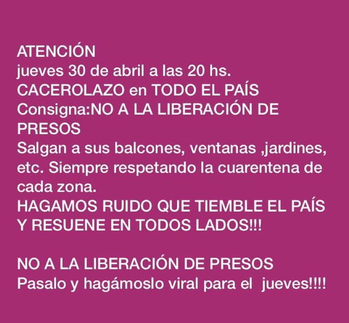 Desde el PRO advirtieron que esta decisión avalada por el gobierno nacional pone en riesgo la seguridad de la sociedad y no respeta el derecho de las víctimas. “En 4 años recuperamos asesinos de la calle para que no sean un peligro para la sociedad y ahora los quieren liberar a todos…”, lamentó Patricia Bullrich en Radio Metro.