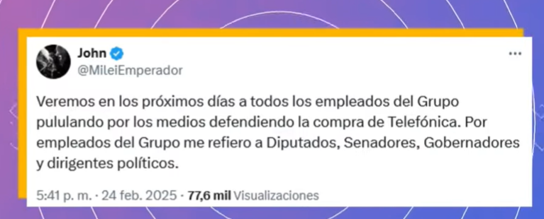 Milei tiene fijado desde hace más de un año un tuit en el que califica a Clarín como “la gran estafa argentina” y cuestiona especialmente la fusión de Telecom y Telefónica, por la que el grupo debió endeudarse en más de 1000 millones de dólares.