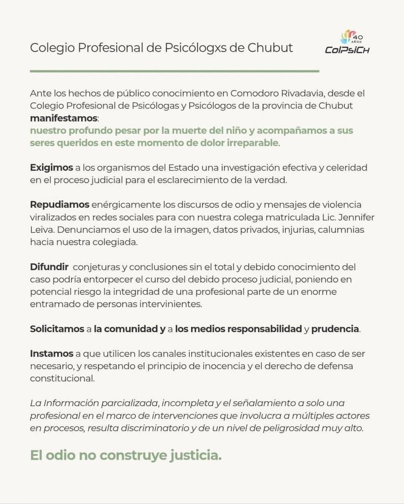 El Colegio Profesional de Psicólogos de Chubut quedó en el centro de una fuerte polémica luego de publicar un comunicado en defensa de la psicóloga feminista que entregó Ángel Lopez, el menor asesinado en Comodoro Rivadavía, a sus asesinos. Tras la reacción negativa de la opinión pública, la entidad decidió eliminar el texto y cerrar sus redes sociales.
